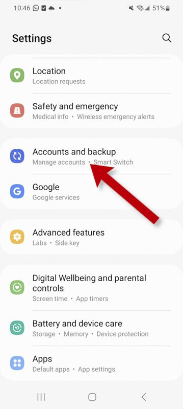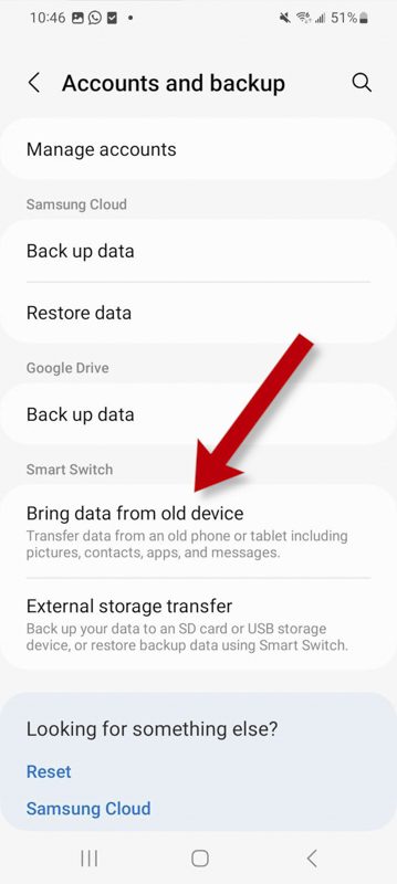 در گوشی‌های جدیدتر سامسونگ، می‌توانید Smart Switch را در بخش حساب‌ها و پشتیبان‌گیری تنظیمات پیدا کنید. برای باز کردن برنامهSmart Switch   Bring، data from old device را انتخاب کنید.
