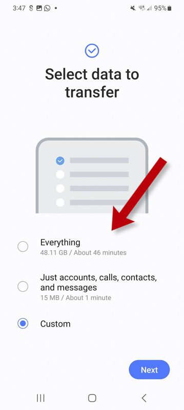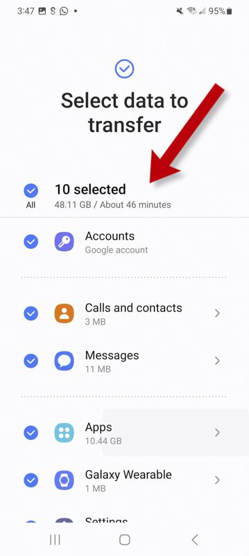 اگر از یک گوشی سامسونگ به یک گوشی سامسونگ جدید منتقل شده اید، می‌توانید همه پیام‌ها، داده‌های برنامه، عکس‌ها و موارد دیگر را ارسال کنید. سایر دستگاه‌های اندرویدی ممکن است به انتقال دستی برخی از اطلاعات به دلیل مشکلات سازگاری نیاز داشته باشند.