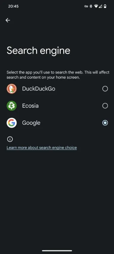 میشان رحمان که خبر اعمال تغییر در Pixel Launcher را منتشر کرده است، می‌گوید درحال‌حاضر کاربران فقط می‌توانند از سرویس جست‌وجوی DuckDuckGo و Ecosia به‌عنوان جایگزین گوگل استفاده کنند.